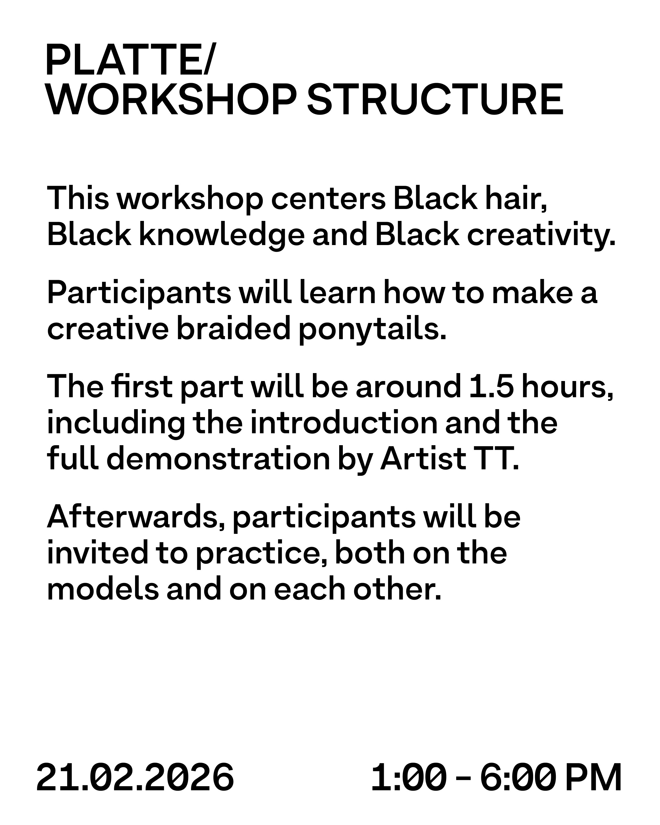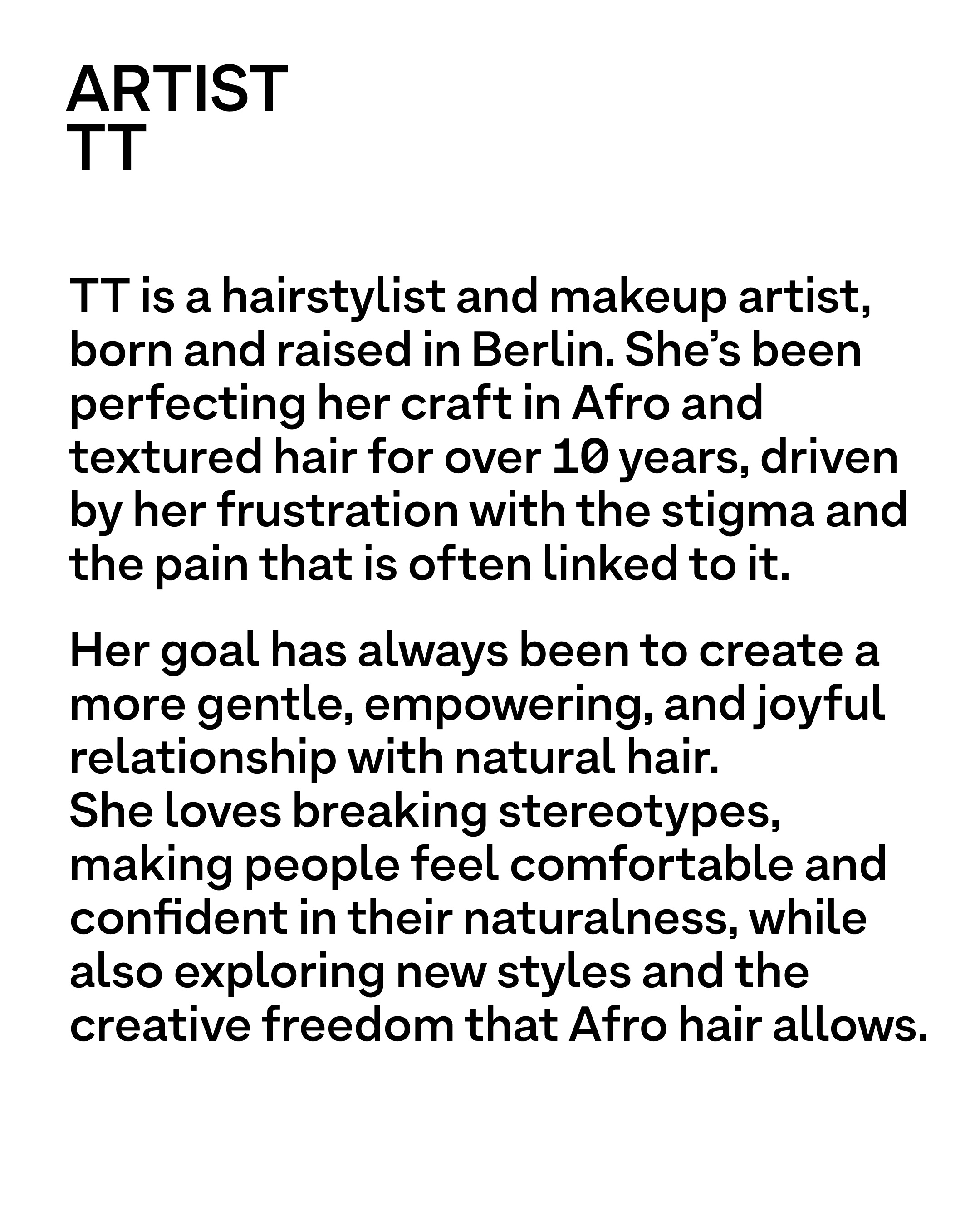 The workshop is led by TT, a Berlin born hairstylist and makeup artist with over 10 years of experience in Afro and textured hair.