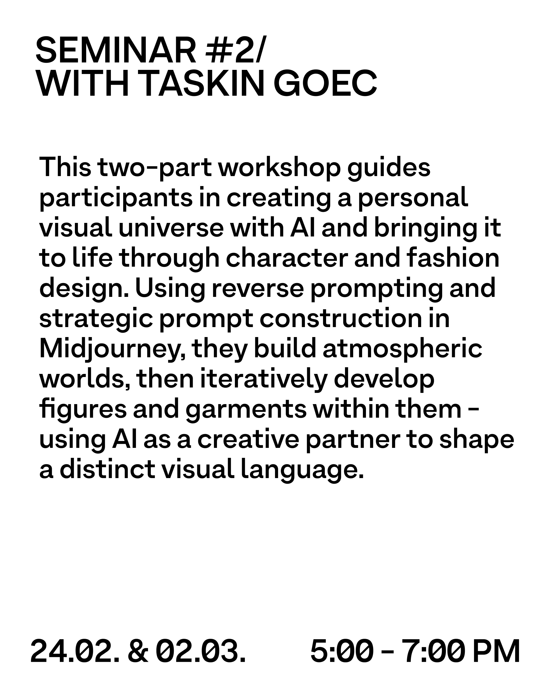 Taskin Goec is a designer and AI artist working bridging creative and tech. With a background in fashion, he brings a deep understanding of materiality and construction to his AI-driven practice. Taskin creates hyperrealistic campaign imagery, editorial content, and motion pieces for luxury fashion and lifestyle brands. He teaches at various universities such as Polimoda and HTW Berlin.